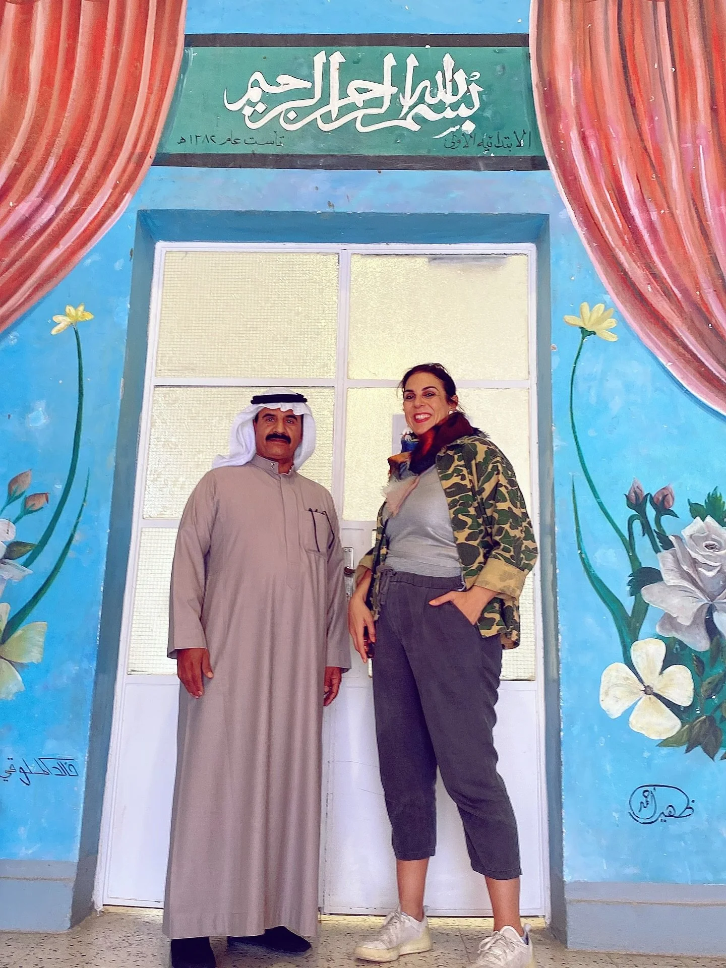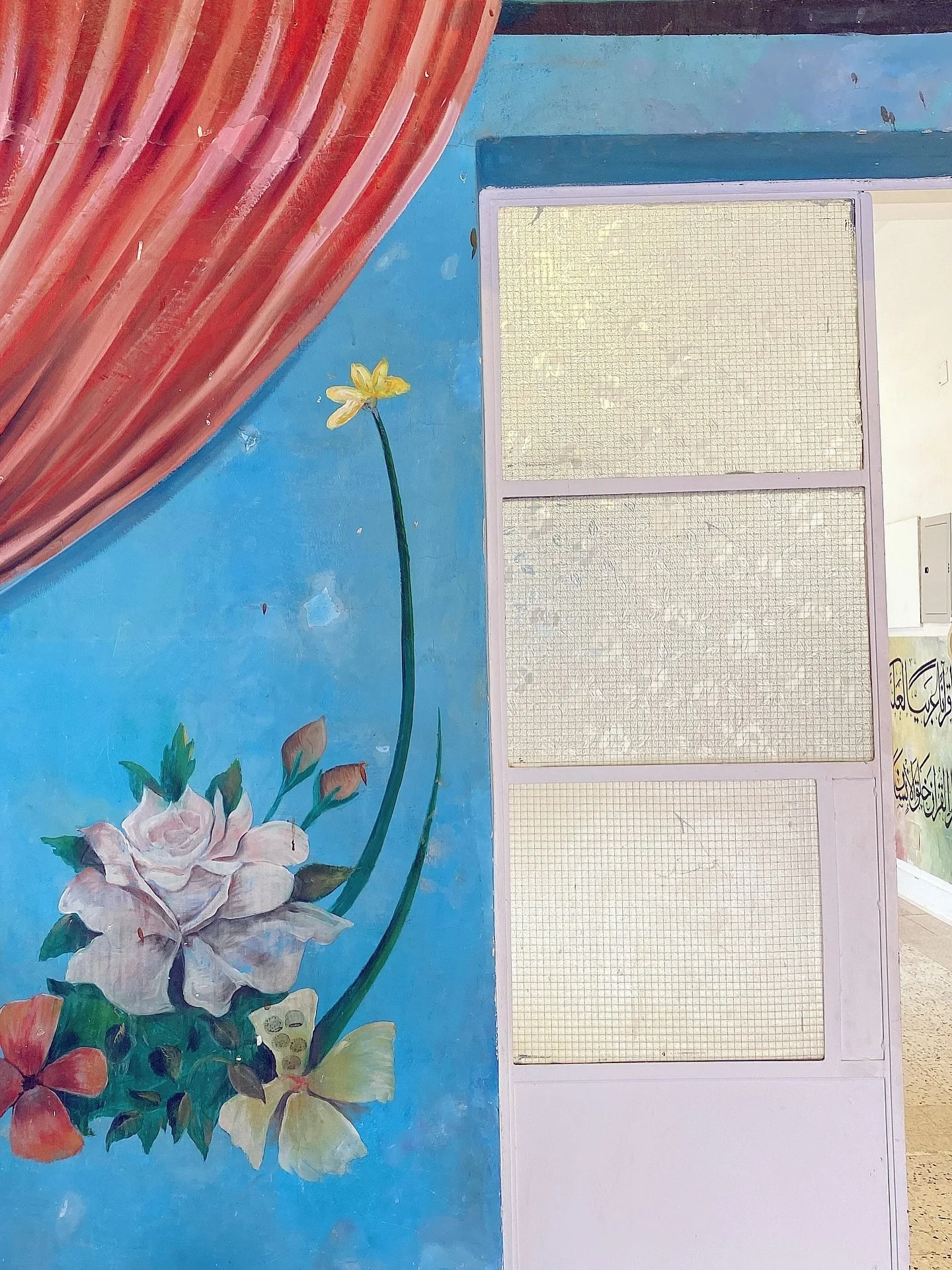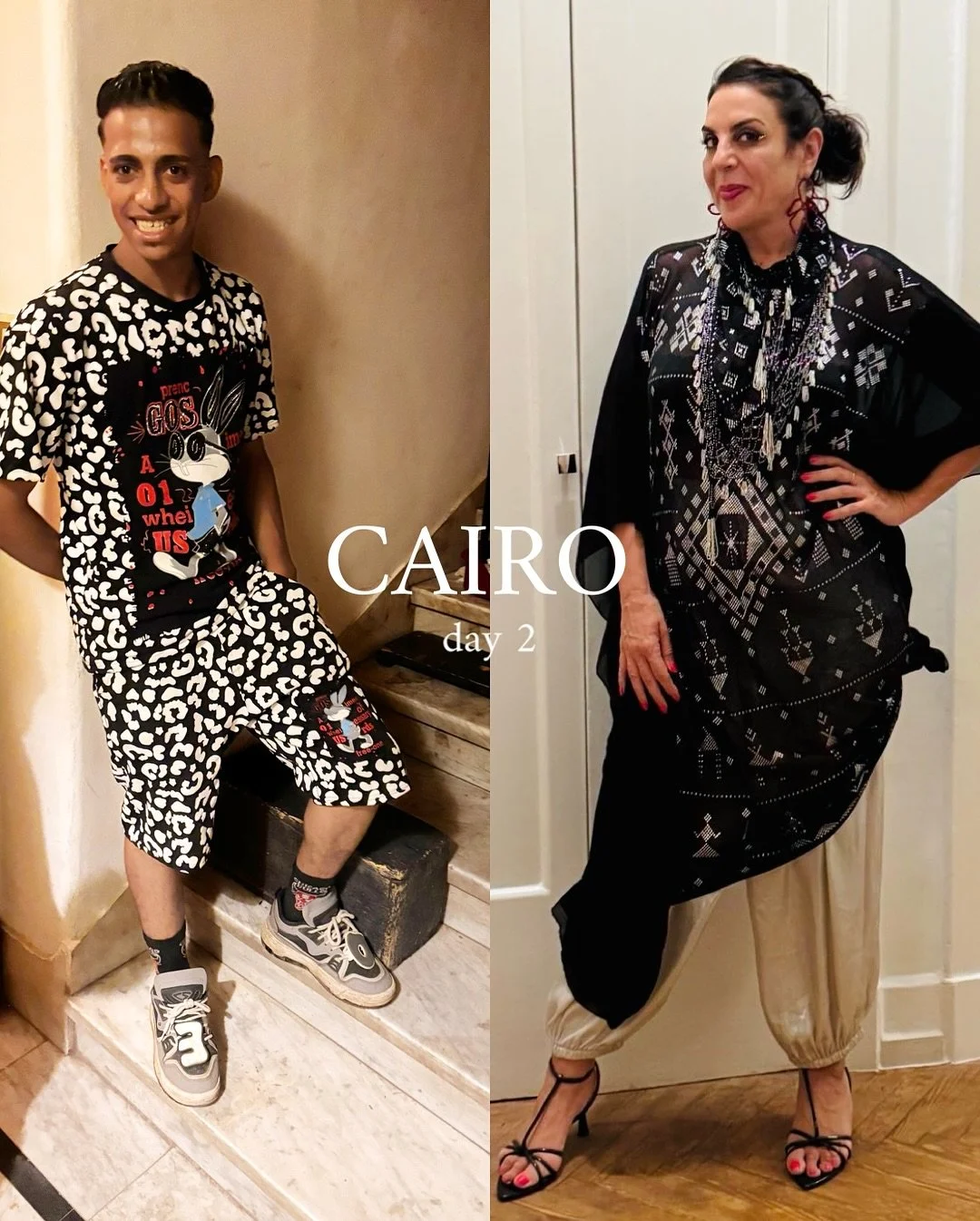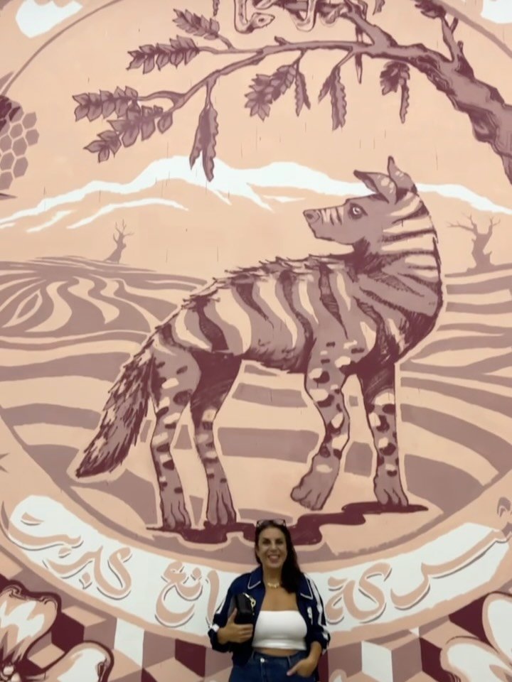 Photograph of two women standing in front of an abstract, geometric patterned wall with large letters spelling 'BEIRUT'.