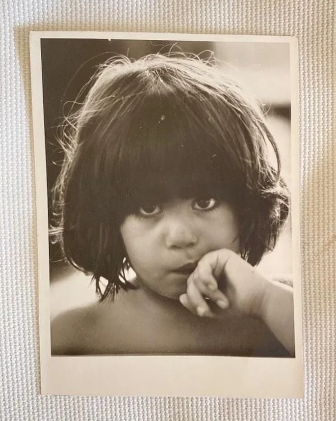 A woman sitting on the floor of an art studio with a concrete textured wall behind her, wearing striped pants and a dark top, with her arms resting on her knees.
