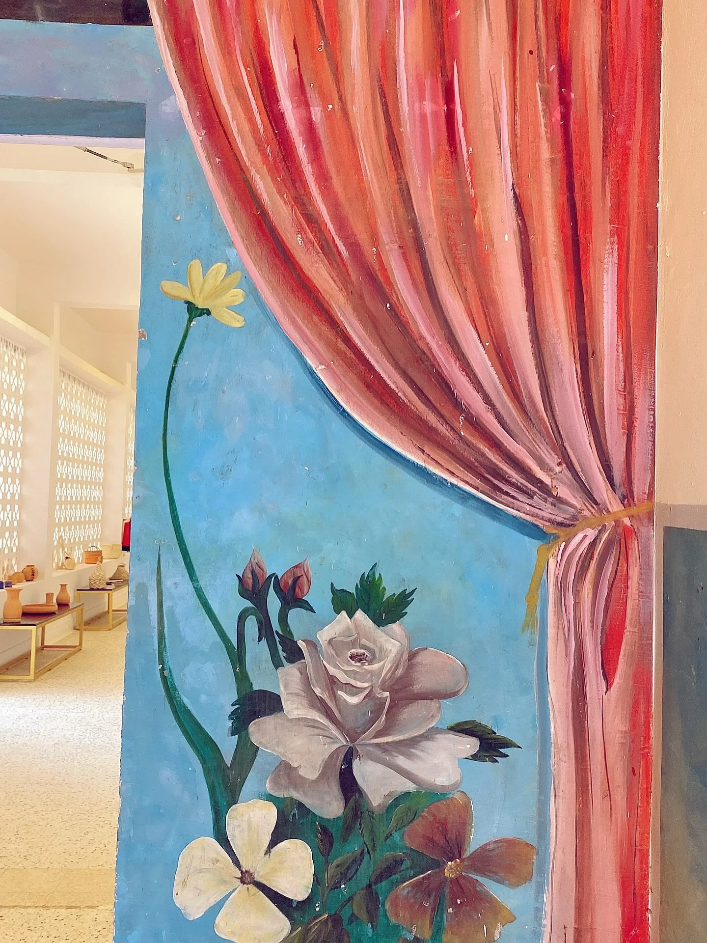 Collage of interior and exterior scenes, including a woman sitting on a couch, a dining area with a mural, a kitchen with shelves and dishes, paintings and textile art, and a window view of trees.