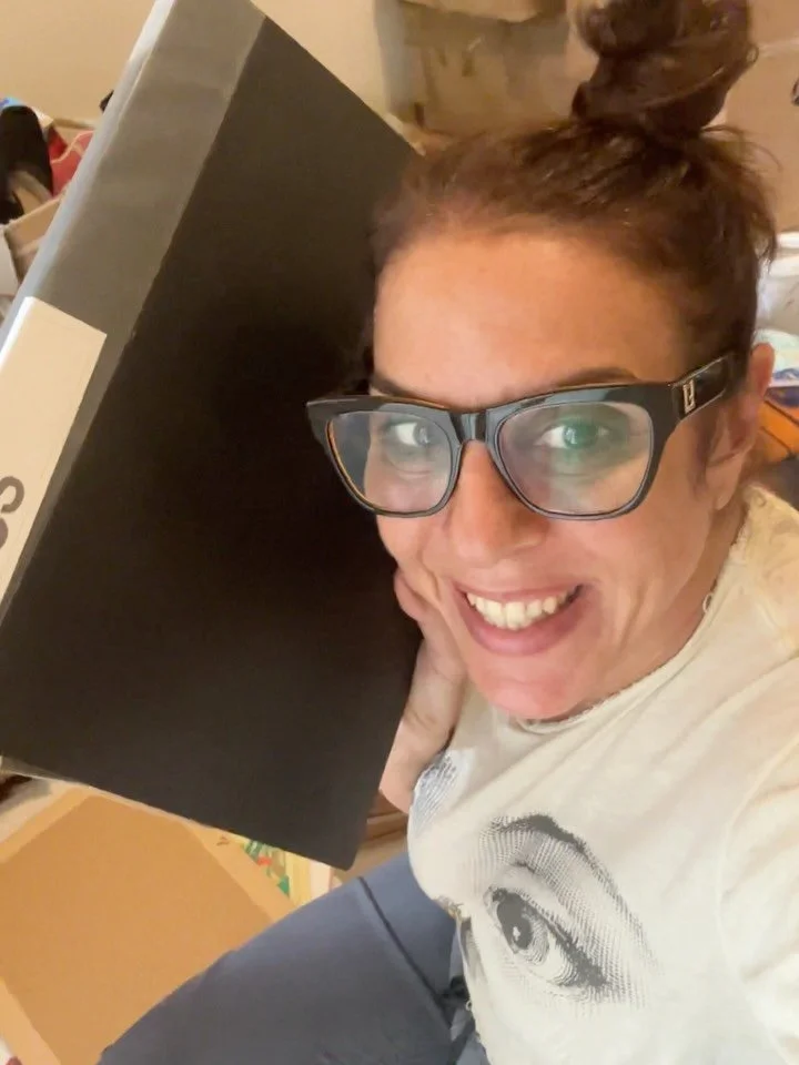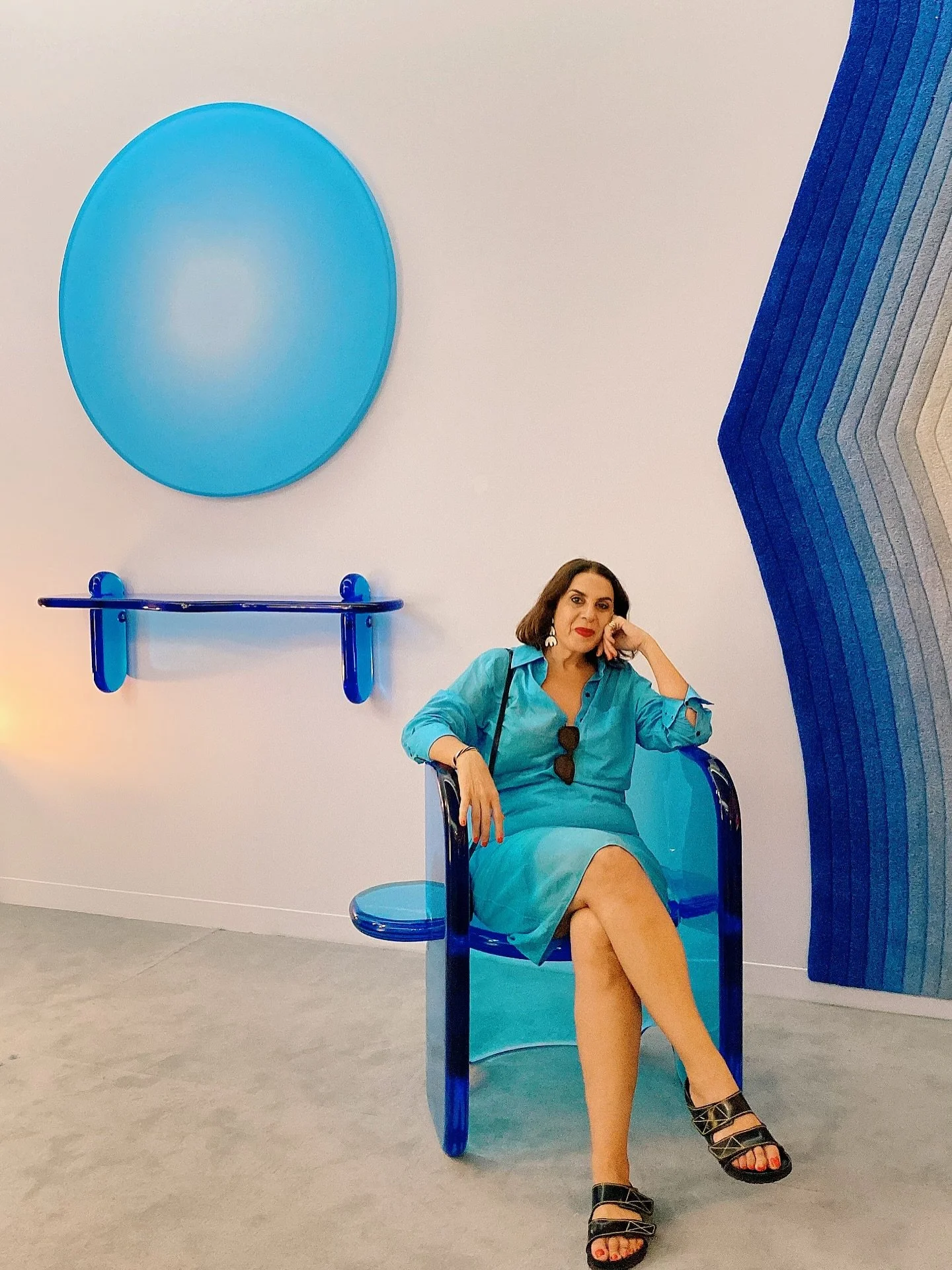 A woman with glasses on her head, large hoop earrings, and a watch, sitting at a desk with color swatches, a tape measure, and a smartphone, smiling and clasping her hands in front of her face. Behind her are art supplies and a yellow vehicle, with bookshelves and lighting in the background.