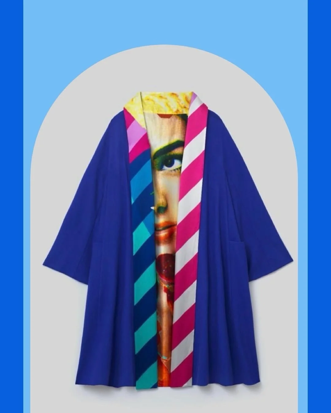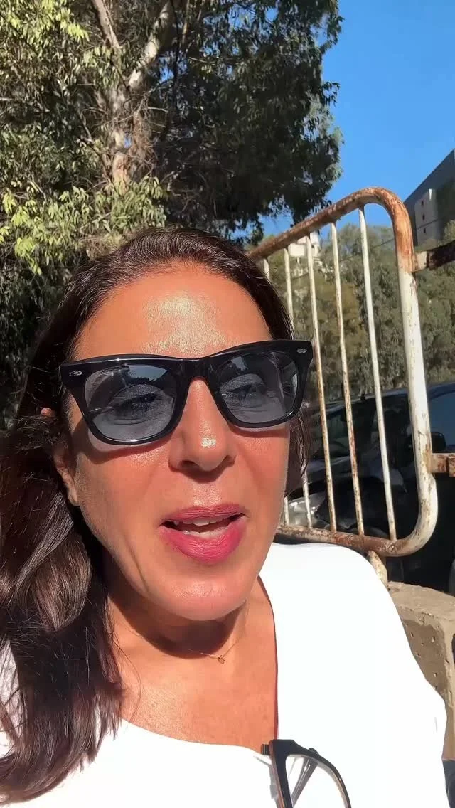 A woman designer Rana Salam standing on an urban balcony with graffiti-covered walls in the background, gazing to the side, dressed in a gray coat and casual clothing.