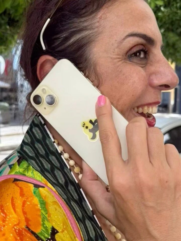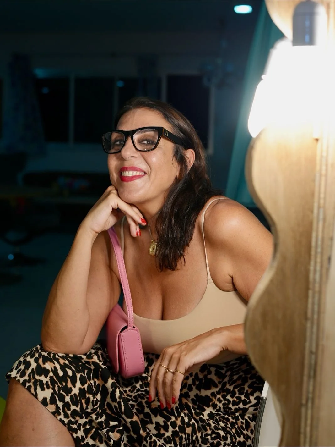 Woman with glasses, jewelry, and leopard print skirt, smiling while using a tablet in a colorful store setting View fullsize