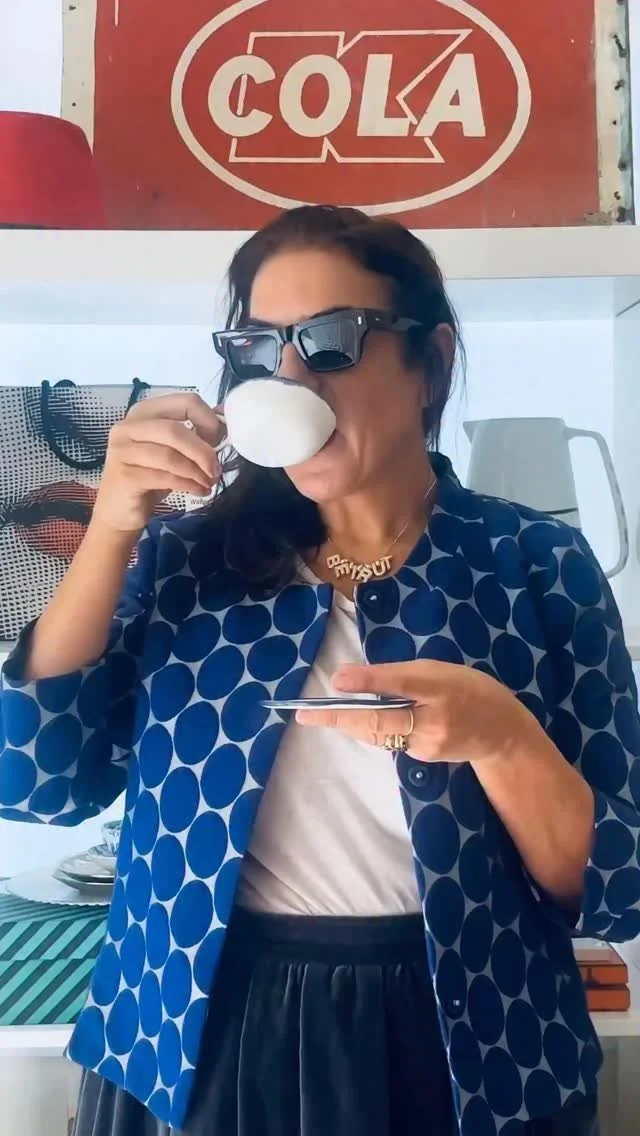A woman designer Rana Salam sitting on a yellow scooter holding a large pink cotton candy at an oceanfront promenade with a clear blue sky in the background.