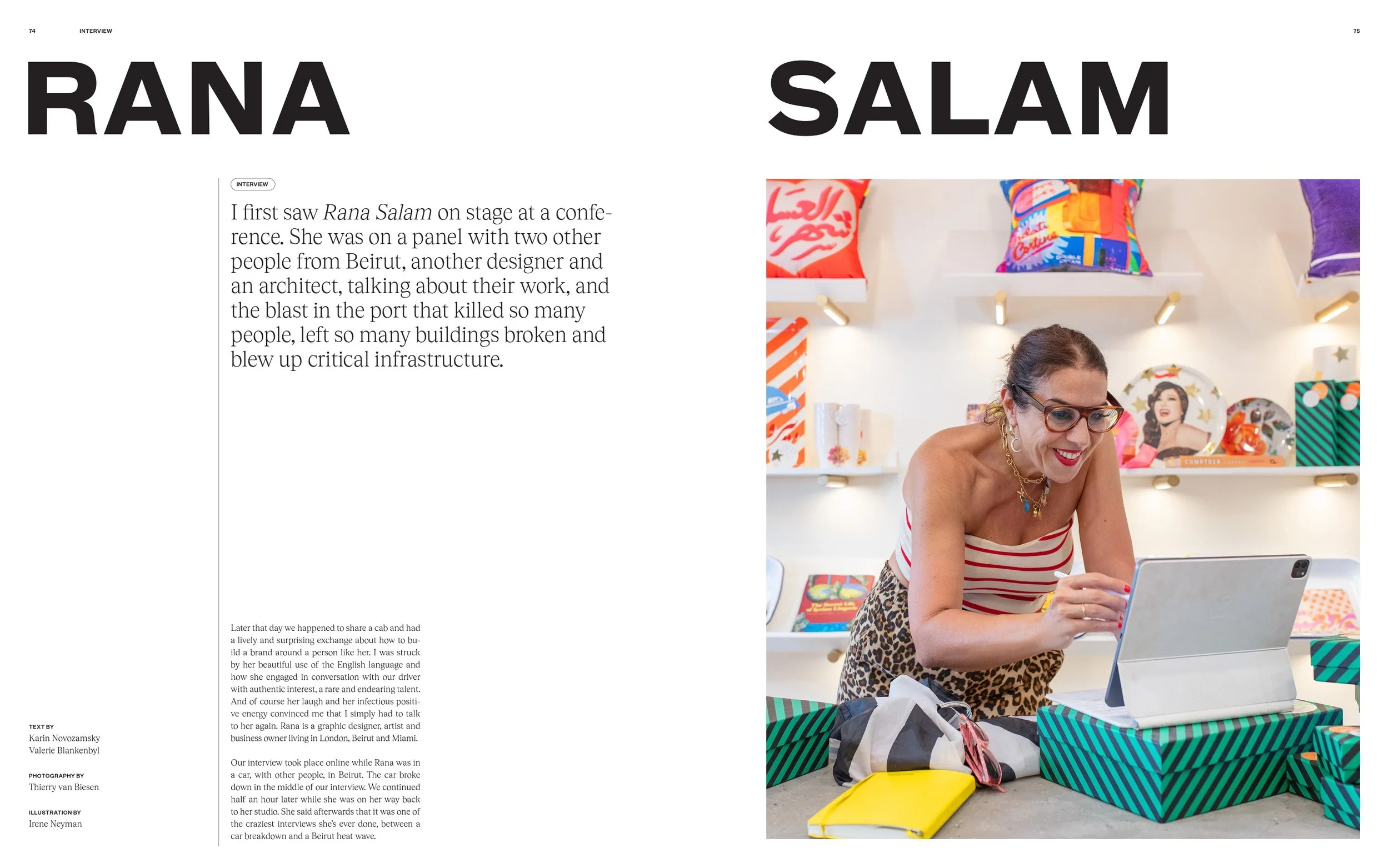 Magazine spread featuring Rana Salam, with interior photos, colorful furniture, art pieces, and decorative objects.