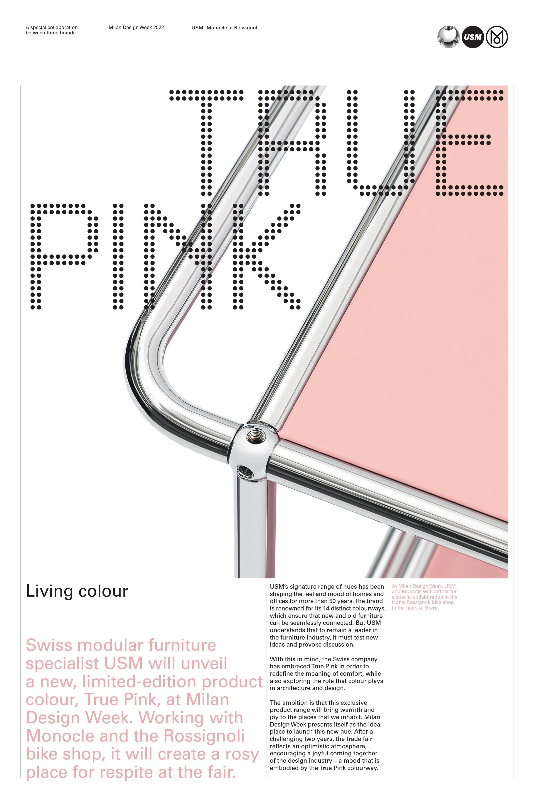 Page from a magazine or brochure showing an article about color moderation, featuring a woman sitting on a bright pink metal bench outside, dressed in a black and white striped outfit, wearing sunglasses, and smiling with red lipstick. The article discusses how color influences feelings and design choices, with an interview with graphic designer Rana Salam.